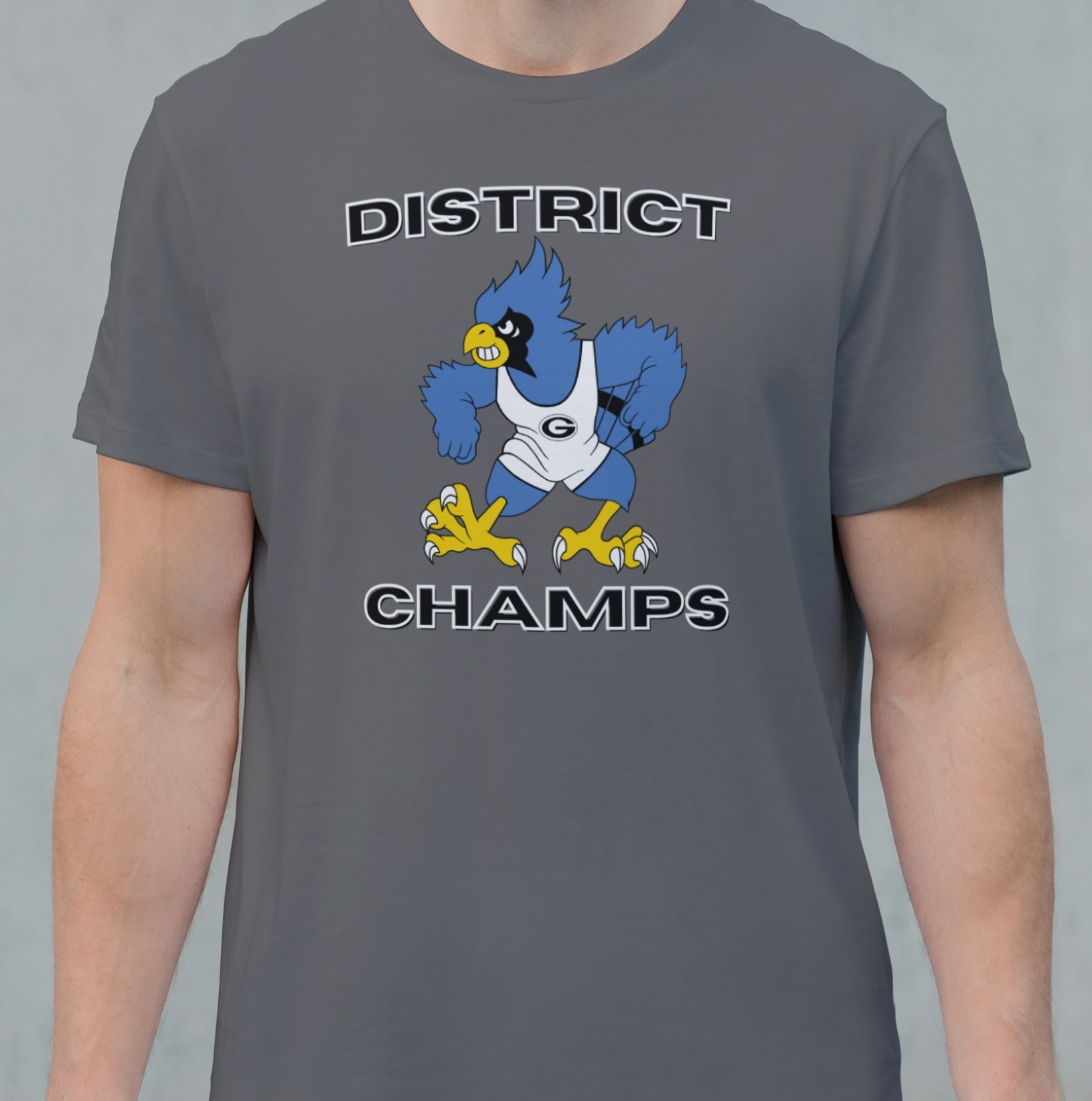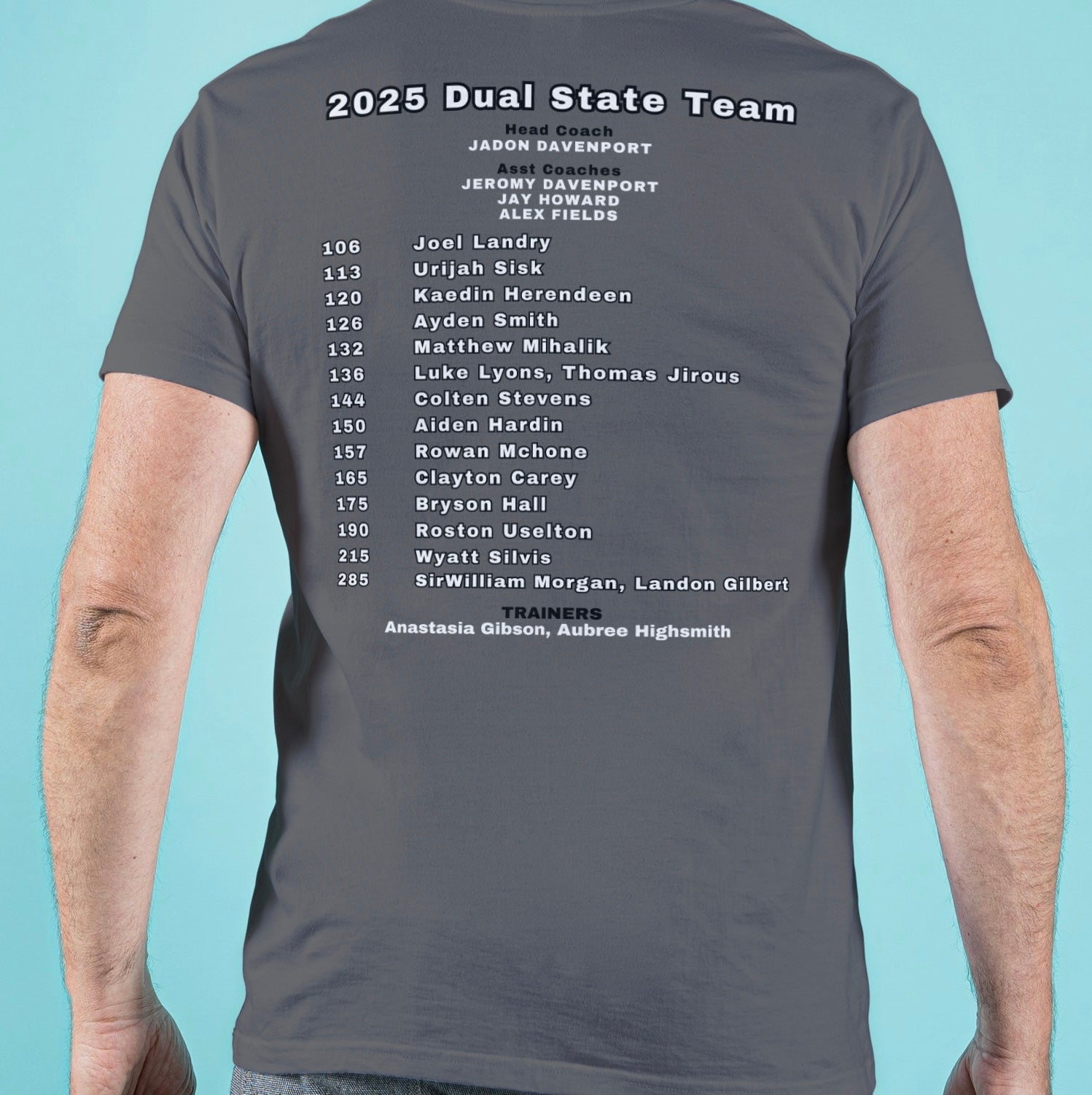 with Dual Champs and Bluejay in singlet on front and coaches, trainers and wrestlers with weights on back.