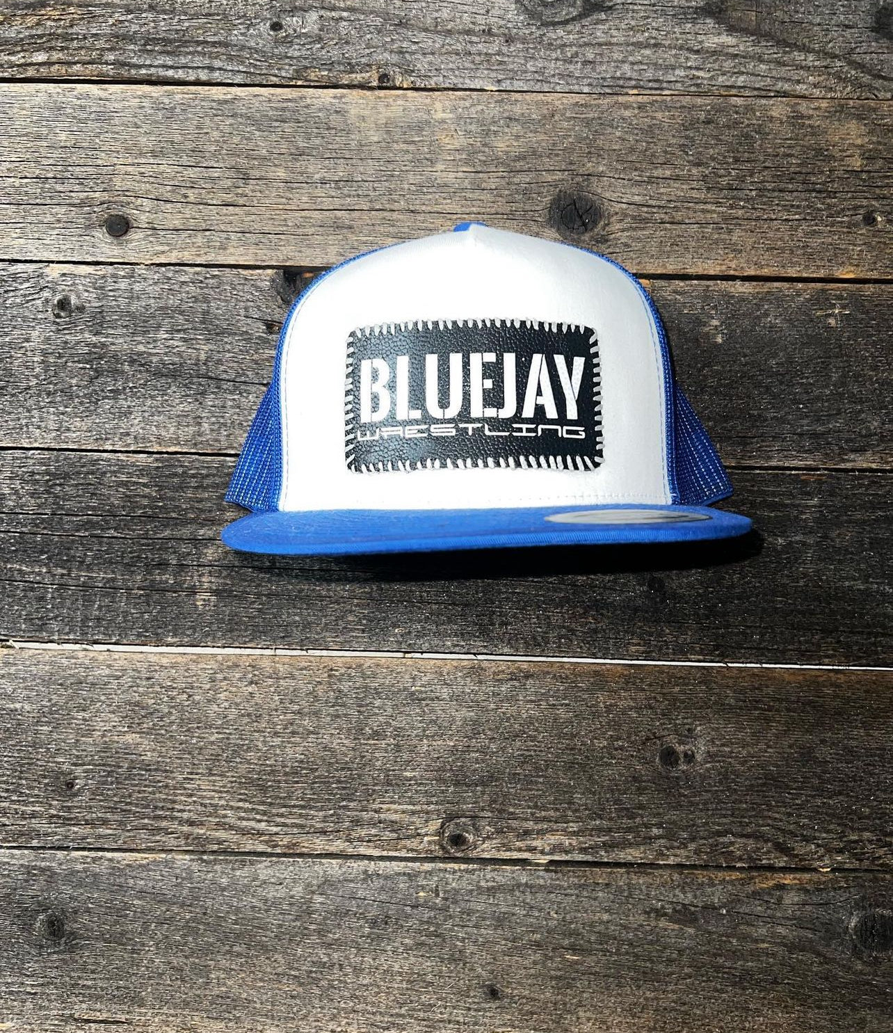 Royal Blue and White SnapBack Flat bill with custom made black leather patch with white vinyl “Guthrie Wrestling” logo