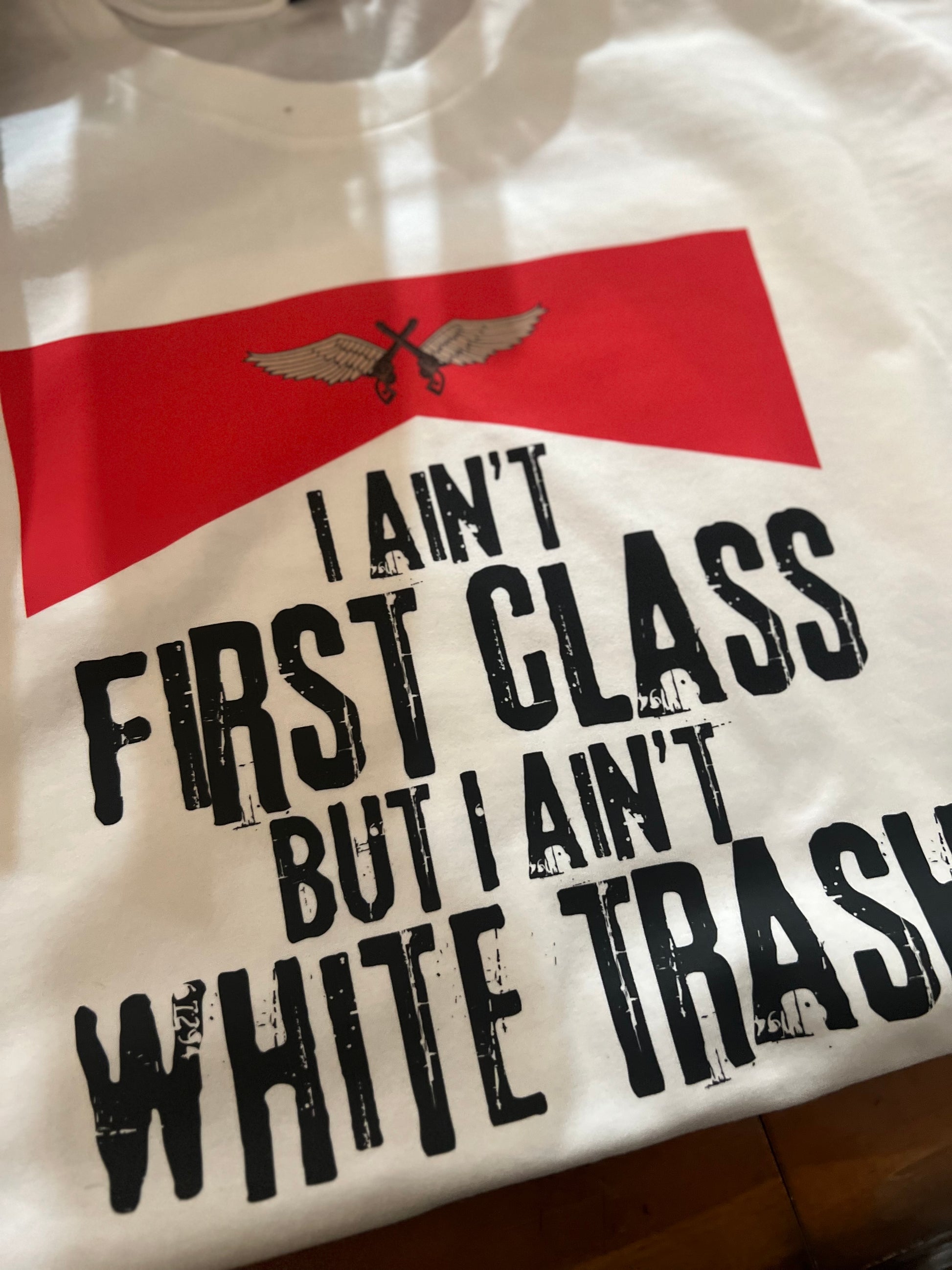 I Ain’t First Class But I Ain’t White Trash Stylish Design Tshirt with Crew Neck and Short Sleeve, Medium Length for Summer Casual Occasions, southern apparel, concert, western