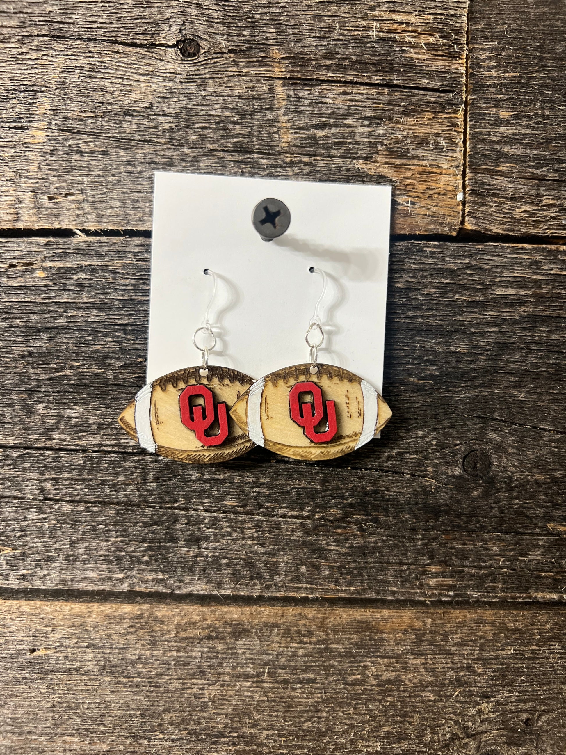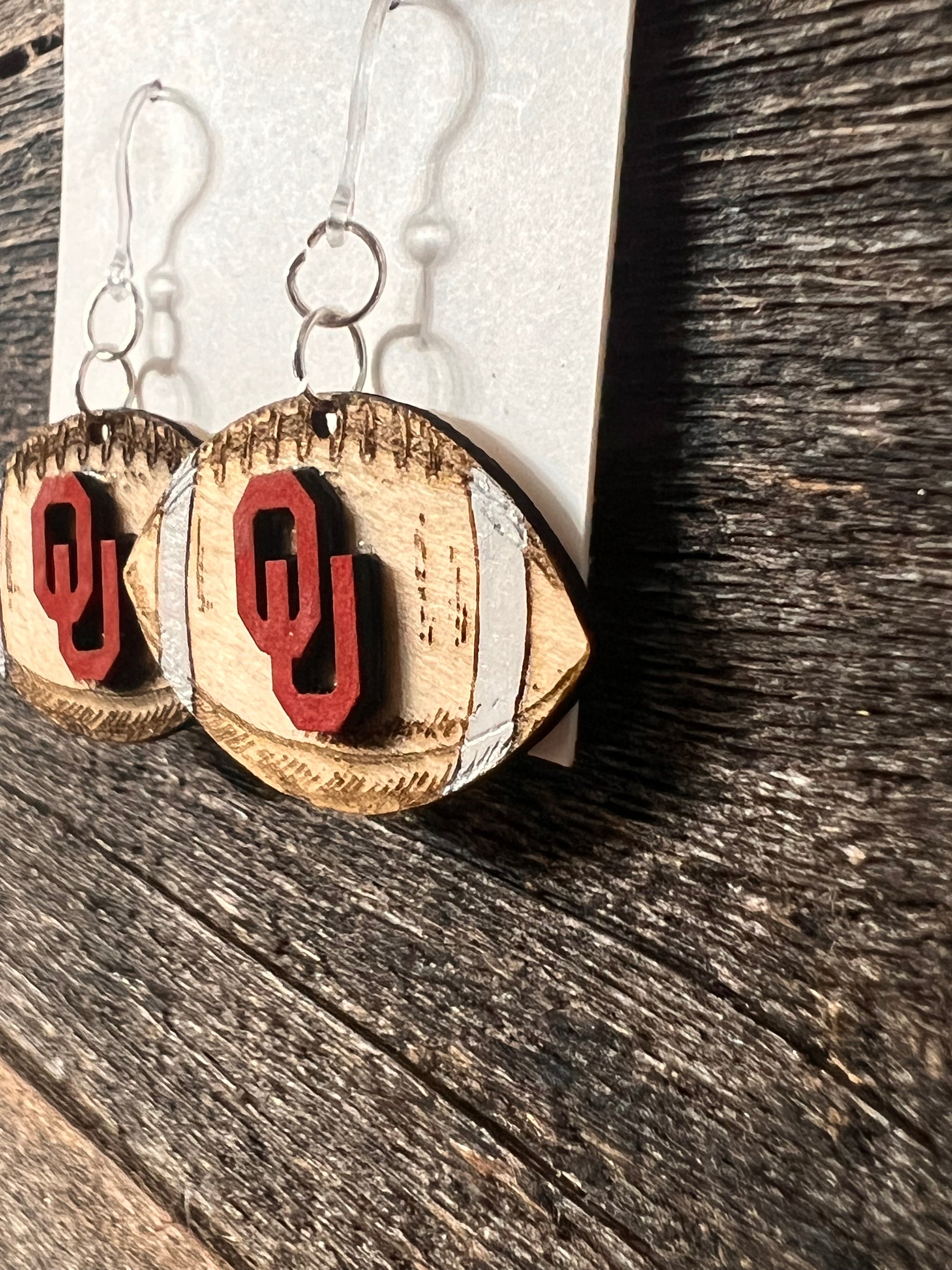 Oklahoma OU Sooners Football Earrings, engraved wood football earrings