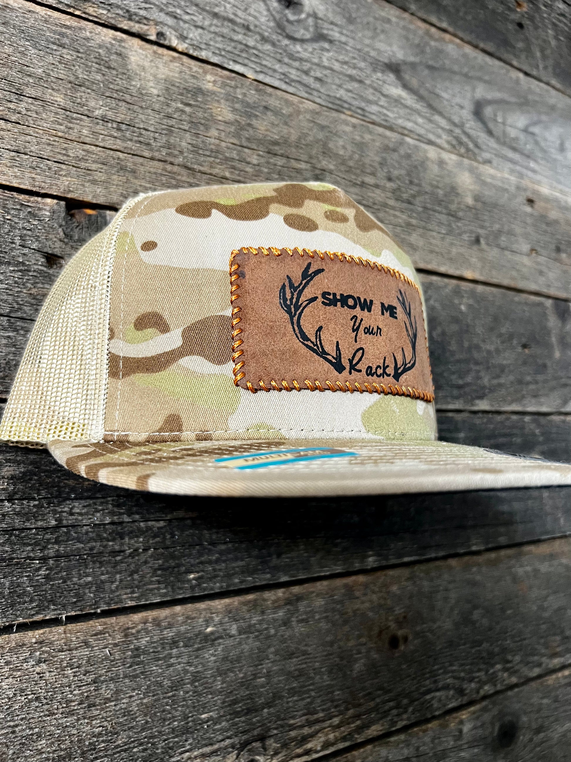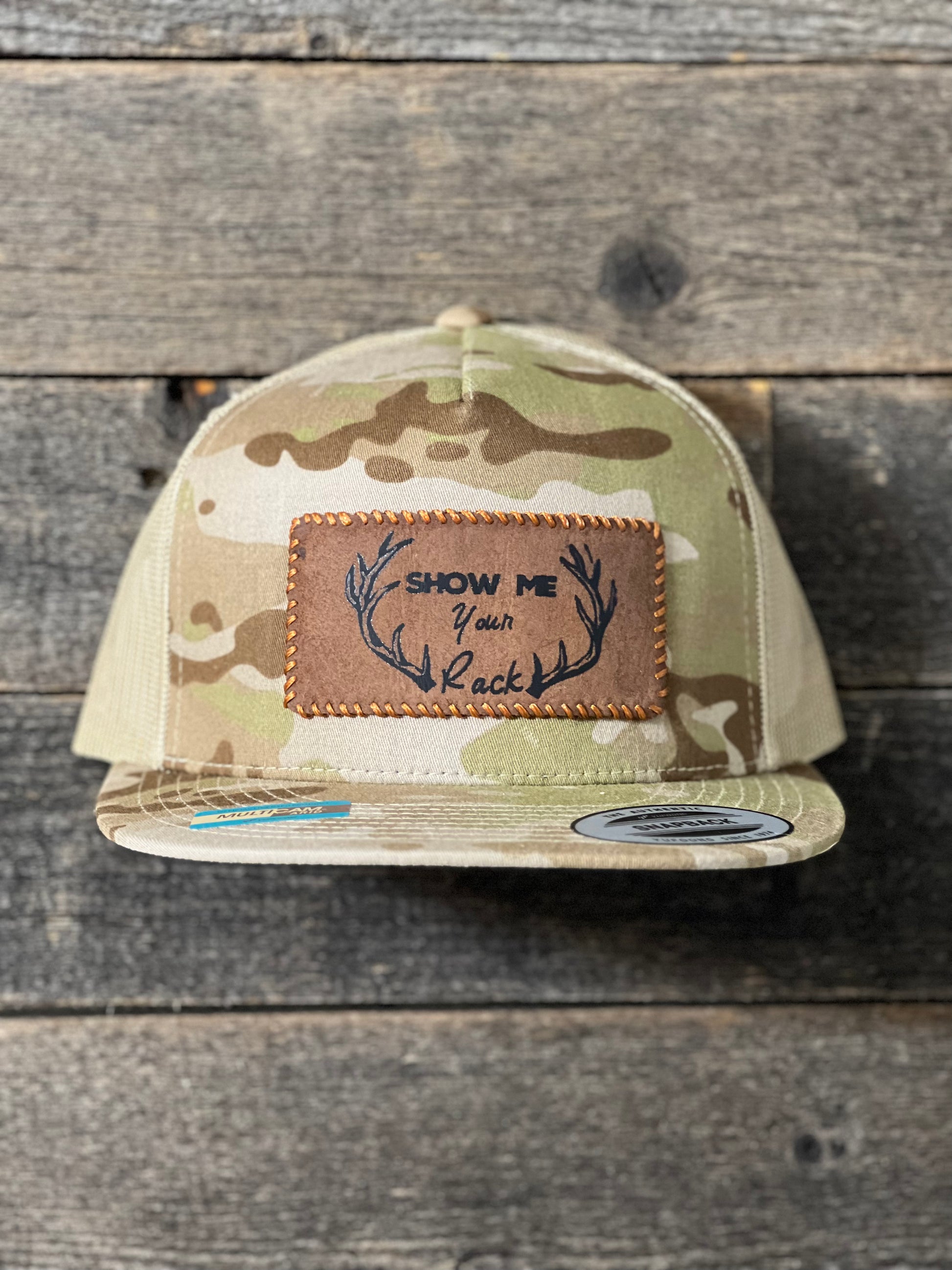 Multi cam flat bill snapback trucker hat with leather show me your rack patch.