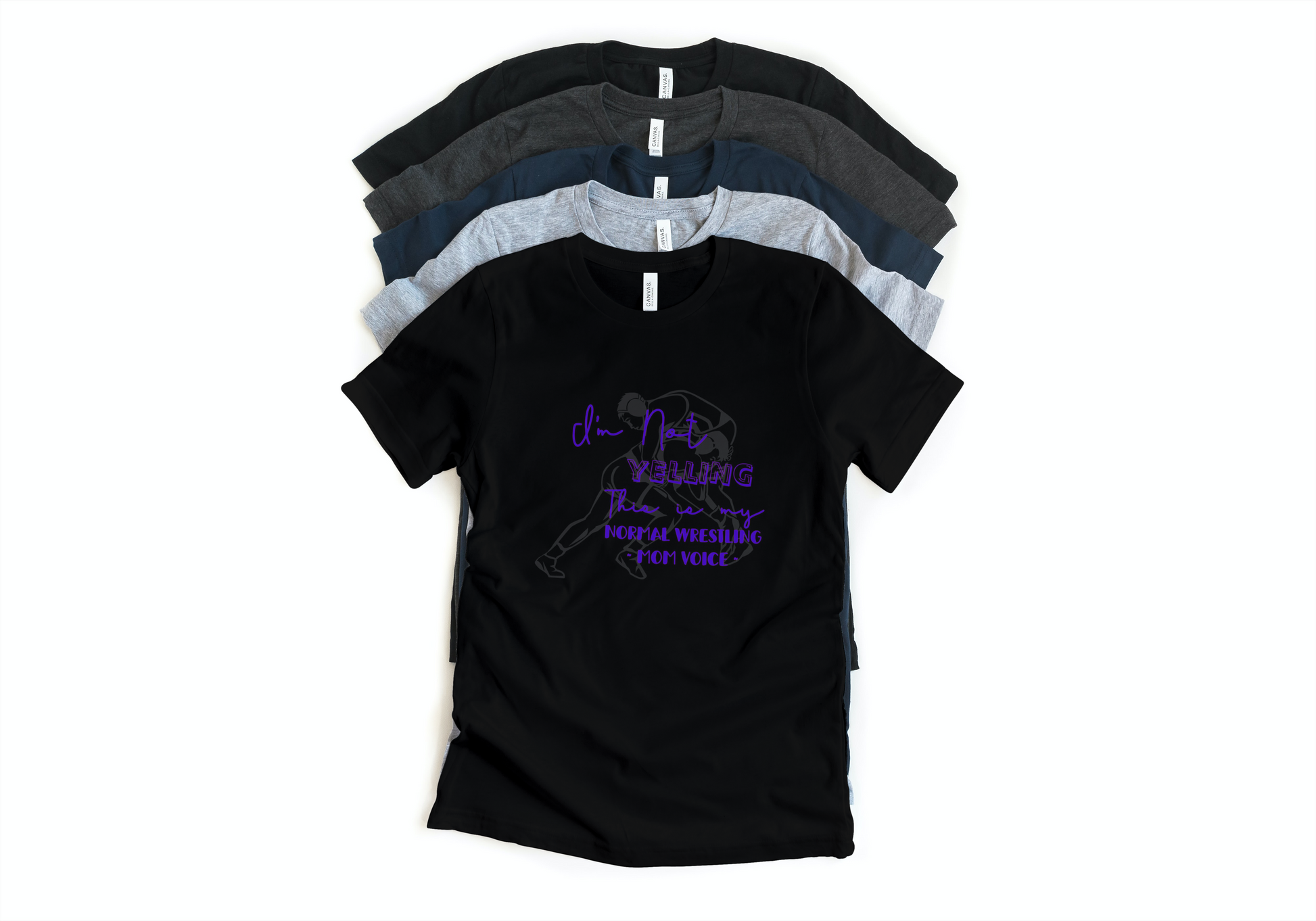 I'm not Yelling, This is My Normal Wrestling Mom Voice Tshirt, with a wrestler graphic in the background.
